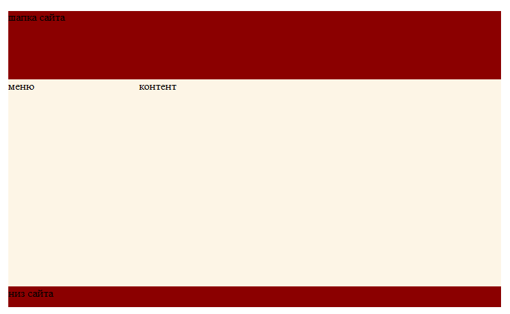 Если визуально разделить нашу страницу на прямоугольные блоки, то мы получим четыре блока: шапка сайта, меню, контент и низ сайта. Таким образом, мы имеем четыре div-а. Давайте напишем html-код страницы с четырьмя div-ами и каждому дадим соответствующий идентификатор (id):