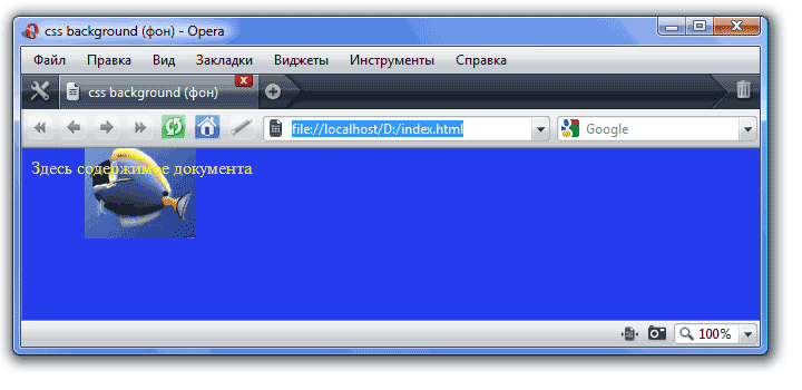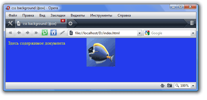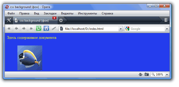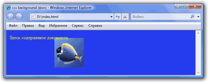 Пример:Сейчас наша страница в браузере выглядит так:body{ background-image:url(picture.gif); background-color:#243CED; color:yellow; }
