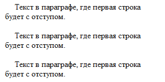 Это свойство отвечает за отступы в абзацах. Отступы задаются в единицах измерения и %, могут быть как положительными (красная строка), так и отрицательными (висячая строка). Пусть у нас есть html-страница с тремя абзацами: