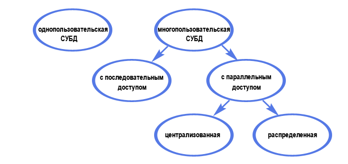 По характеру использования СУБД делят на однопользовательские (предназначенные для создания и использования БД на персональном компьютере) и многопользовательские (предназначенные для работы с единой БД нескольких компьютеров, объединенных в локальные сети). Вообще деление по характеру использования можно представить следующей схемой: