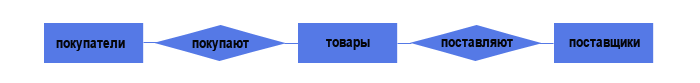 Давайте в качестве примера рассмотрим интернет-магазин. У магазина есть товары, которые поставляются поставщиками и покупаются покупатели. Это можно представить тремя объектами и двумя связями: