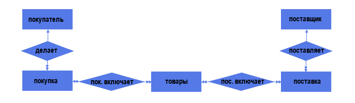 Теперь у нас пять объектов и четыре связи. Две связи "один ко многим" (один поставщик может осуществить несколько поставок, но каждая поставка осуществляется только одним поставщиком, аналогично и для связи Покупатель - Покупка) и две связи "многие ко многим" (каждая поставка может содержать несколько товаров, а один и тот же товар может содержаться в нескольких поставках, аналогично и для связи Покупка - Товар).