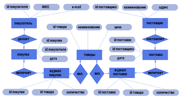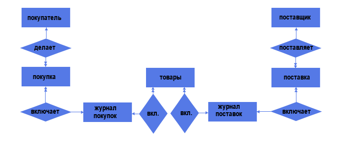 Таким образом, у нас появилось еще два объекта - журнал покупок и журнал поставок, со связями "один ко многим" (один журнал поставок может включать несколько поставок, но каждая поставка может входить только в один журнал, аналогично и для остальных).