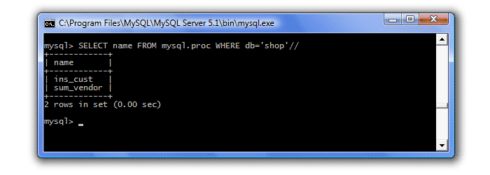То получим имена всех процедур всех баз данных, имеющихся на сервере. Нас, например, на данный момент интересуют только процедуры базы данных shop, поэтому изменим запрос: