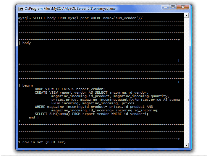 SELECT body FROM mysql.proc WHERE name='sum_vendor'//