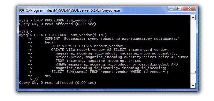 Создавать комментарии крайне просто. Для этого сразу после списка параметров, но еще до начала тела хранимой процедуры указываем ключевое слово COMMENT 'здесь комментарий'. Давайте удалим нашу процедуру sum_vendor и создадим новую, с комментарием: