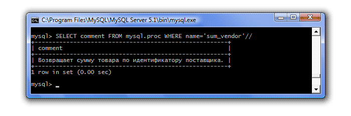 SELECT comment FROM mysql.proc WHERE name='sum_vendor'//