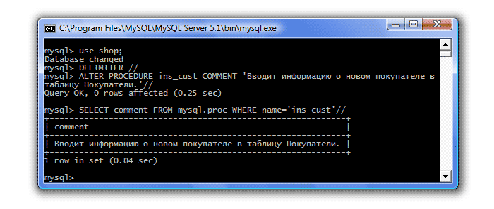 Вообще-то, чтобы добавить комментарий, вовсе не обязательно было удалять старую процедуру. Можно было отредактировать имеющуюся хранимую процедуру с помощью оператора ALTER PROCEDURE. Давайте посмотрим, как это сделать, на примере процедуры ins_cust из прошлого урока. Эта процедура вводит информацию о новом покупателе в таблицу Покупатели (customers). Давайте добавим комментарий к этой процедуре: