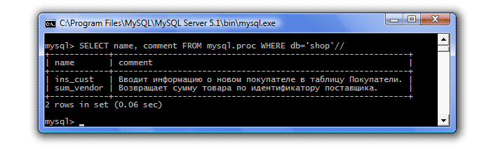 В нашей базе данных всего две процедуры, и комментарии к ним кажутся излишними. Не ленитесь, обязательно пишите комментарии. Представьте, что в нашей базе данных десятки или сотни процедур. Сделав нужный запрос, вы без труда узнаете, какие процедуры есть и что они делают и поймете, что комментарии - это не излишества, а экономия вашего времени в будущем. Кстати, а вот и сам запрос: