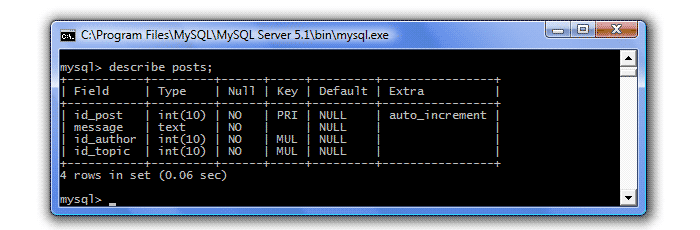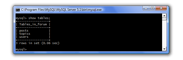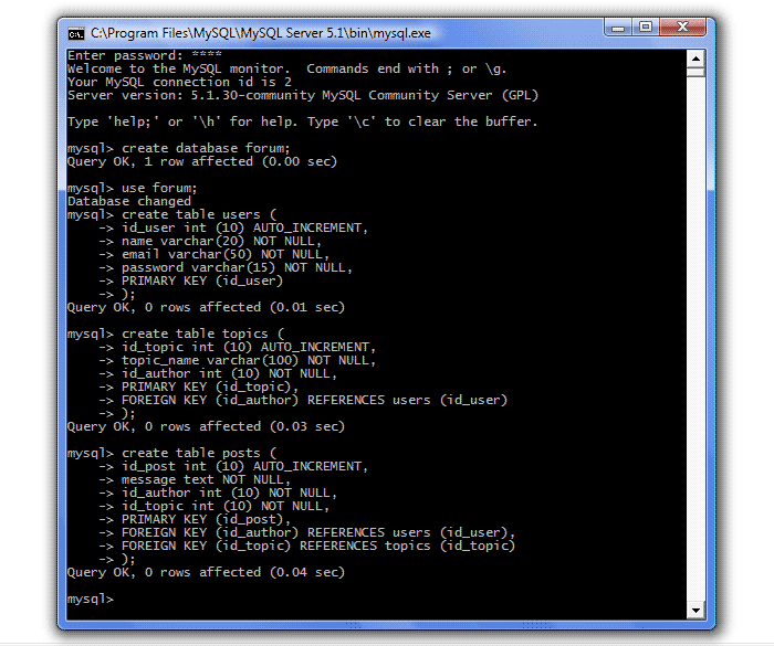 Запускаем сервер MySQL (Пуск - Программы - MySQL - MySQL Server 5.1 - MySQL Command Line Client), вводим пароль, создаем БД forum (create database forum;), выбираем ее для использования (use forum;) и создаем три наших таблицы: