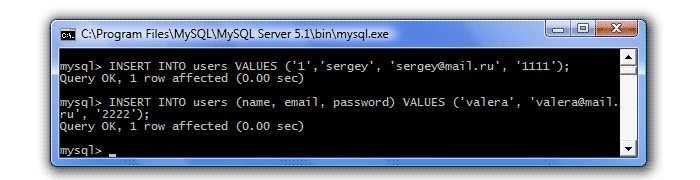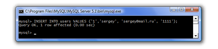 INSERT INTO users VALUES ('1','sergey', 'sergey@mail.ru', '1111');