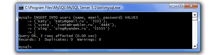 Но прежде внесем информацию еще о нескольких пользователях. Чтобы добавить сразу несколько строк, надо просто перечислять скобки со значениями через запятую: