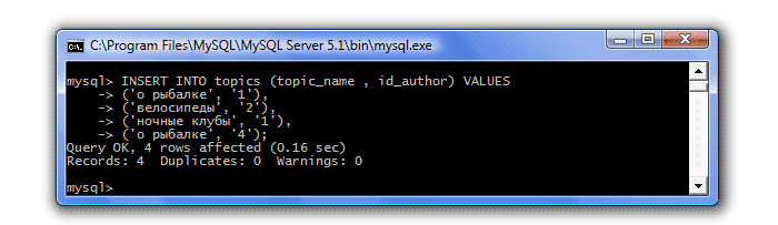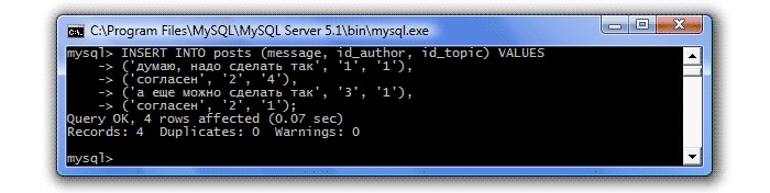 Теперь внесем несколько строк в таблицу posts (сообщения), помня, что в ней у нас 2 внешних ключа, т.е. id_author и id_topic, которые мы будем вносить должны присутствовать в связанных с ними таблицах: