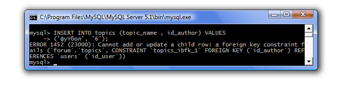 Теперь давайте попробуем внести еще одну тему, но с id_author, которого в таблице users нет (т.к. мы внесли в таблицу users только 5 пользователей, то id=6 не существует):