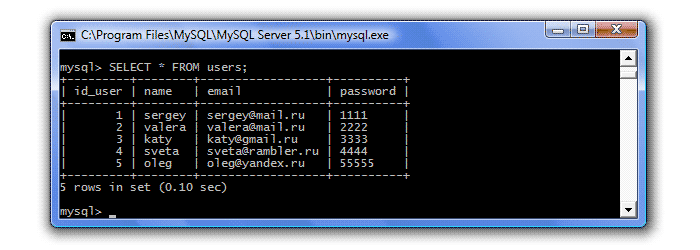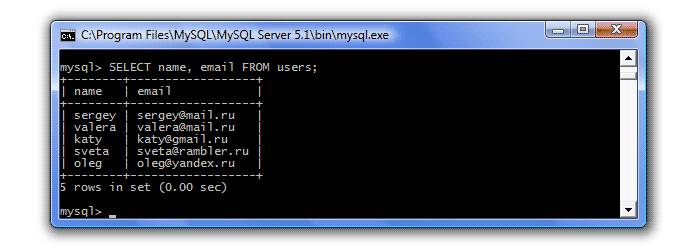 Ну, а если мы захотим посмотреть, например, имена и e-mail наших пользователей, то мы перечислим интересующие столбцы через запятую: