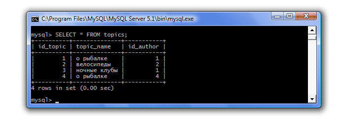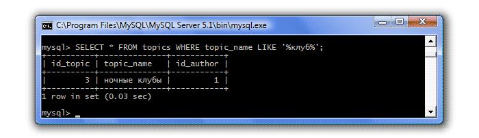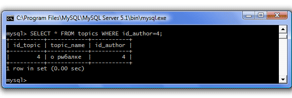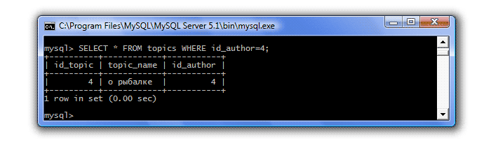 | = (равно) | Отбираются значения равные указанному Пример: SELECT * FROM topics WHERE id_author=4; Результат: