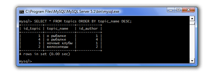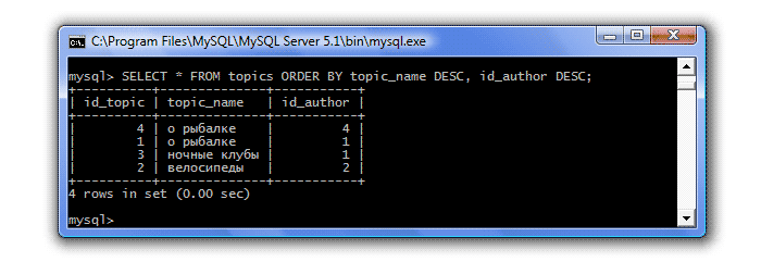 Сортировку можно производить сразу по нескольким столбцам. Например, следующий запрос отсортирует данные по столбцу topic_name, и если в этом столбце будет несколько одинаковых строк, то в столбце id_author будет осуществлена сортировка по убыванию: