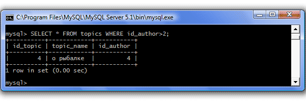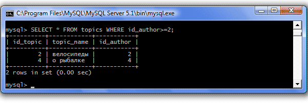 | >= (больше или равно) | Отбираются значения большие и равные указанному Пример: SELECT * FROM topics WHERE id_author>=2; Результат: