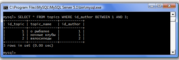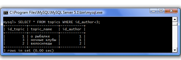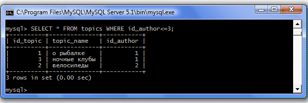 | < (меньше) | Отбираются значения меньше указанного Пример: SELECT * FROM topics WHERE id_author<3; Результат: