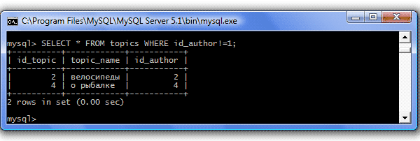 | != (не равно) | Отбираются значения не равные указанному Пример: SELECT * FROM topics WHERE id_author!=1; Результат:
