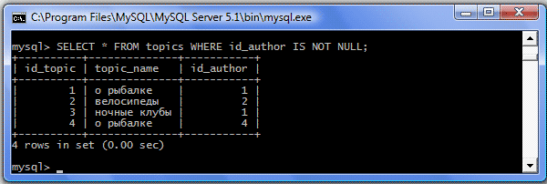 | IS NOT NULL | Отбираются строки, имеющие значения в указанном поле Пример: SELECT * FROM topics WHERE id_author IS NOT NULL; Результат: