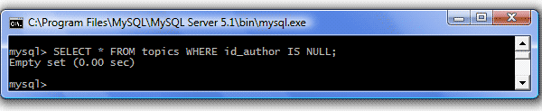 | IS NULL | Отбираются строки, не имеющие значения в указанном поле Пример: SELECT * FROM topics WHERE id_author IS NULL; Результат:
