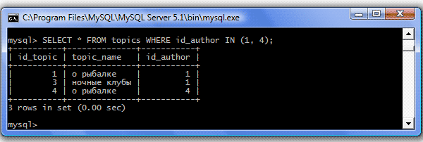 | IN (значение содержится) | Отбираются значения, соответствующие указанным Пример: SELECT * FROM topics WHERE id_author IN (1, 4); Результат: