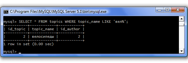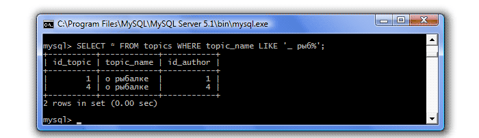 | LIKE (соответствие) | Отбираются значения, соответствующие образцу Пример: SELECT * FROM topics WHERE topic_name LIKE 'вел%'; Результат: