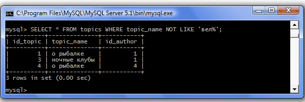 | NOT LIKE (не соответствие) | Отбираются значения, не соответствующие образцу Пример: SELECT * FROM topics WHERE topic_name NOT LIKE 'вел%'; Результат: