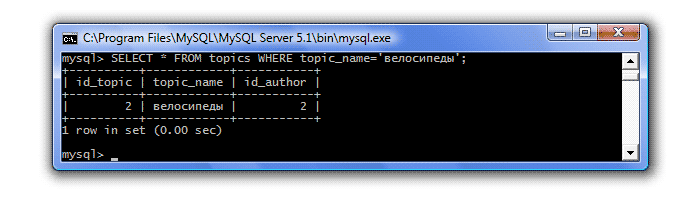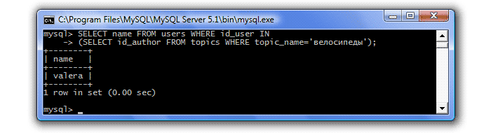 SELECT id_author FROM topics WHERE topic_name='велосипеды' - Полученный результат (id_author=2) передаст во внешний запрос, который примет вид: