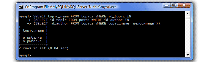 SELECT topic_name FROM topics WHERE id_topic IN (4,1); - И выдаст окончательный результат (topic_name: о рыбалке, о рыбалке). Т.е. автор темы "велосипеды" оставлял сообщения в теме "О рыбалке", созданной Сергеем (id=1) и в теме "О рыбалке", созданной Светой (id=4).