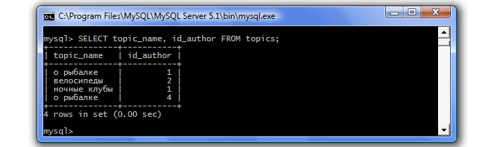 Чтобы результирующая таблица выглядела так, как мы хотели, необходимо указать условие объединения. Мы связываем наши таблицы по идентификатору автора, это и будет нашим условием. Т.е. мы укажем в запросе, что необходимо выводить только те строки, в которых значения поля id_author таблицы topics совпадают со значениями поля id_user таблицы users: