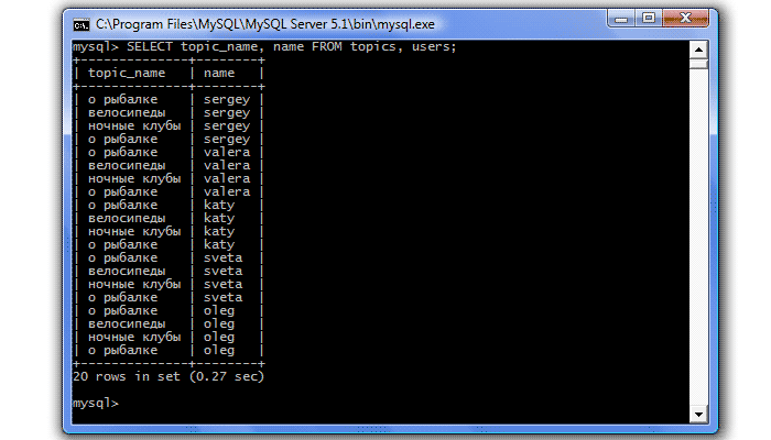 - Если в одной из объединяемых таблиц есть строка с идентификатором, которого нет в другой объединяемой таблице, то в результирующей таблице строки с таким идентификатором не будет. В нашем примере есть пользователь Oleg (id=5), но он не создавал тем, поэтому в результате запроса его нет.