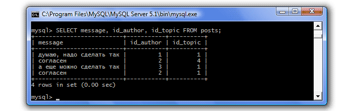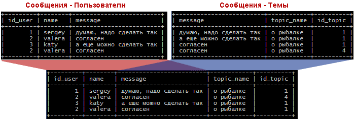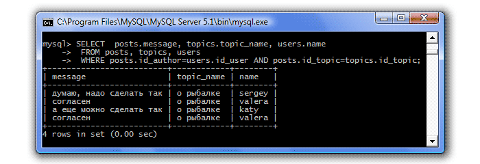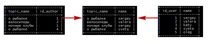 Т.е. мы объединили таблицы Сообщения и Пользователи условием posts.id_author=users.id_user, а таблицы Сообщения и Темы - условием posts.id_topic=topics.id_topic