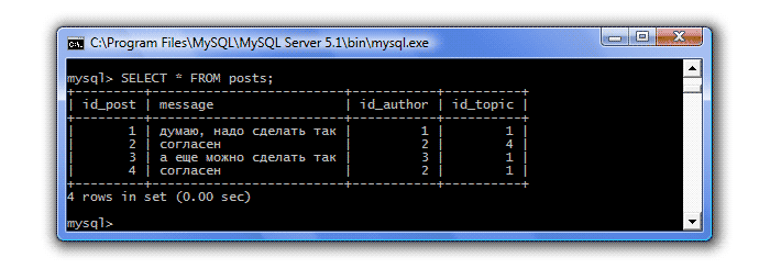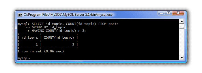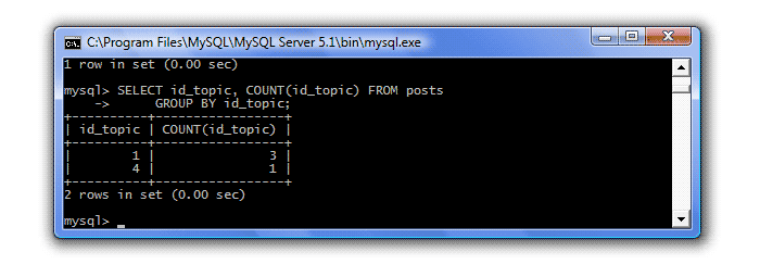 Ну вот, в теме с id=1 у нас 3 сообщения, а с id=4 - одно. Кстати, если бы в поле id_topic были возможны отсутствия значений, то такие строки были бы объединены в отдельную группу со значением NULL.