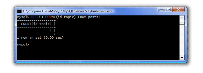 А что, если нам надо лишь узнать сколько сообщений на форуме имеется. Для этого можно воспользоваться встроенной функцией COUNT(). Эта функция подсчитывает число строк. Причем, если в качестве аргумента этой функции выступает *, то подсчитываются все строки таблицы. А если в качестве аргумента указывается имя столбца, то подсчитываются только те строки, которые имеют значение в указанном столбце.