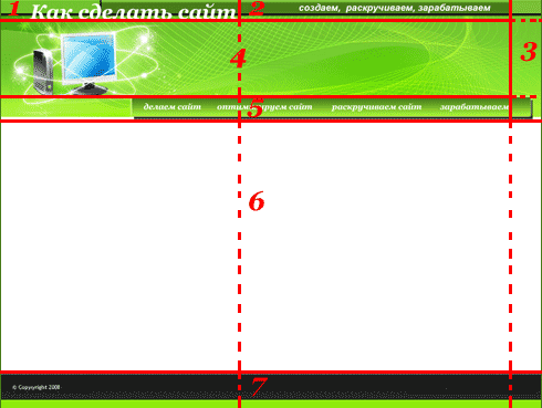 Эту картинку нам надо перенести в HTML. Попробуем сделать так называемый фиксированный дизайн, взяв за основу таблицу. Поэтому наложим на эту картинку сетку таблицы, чтобы разделить на структурные элементы, например, так: