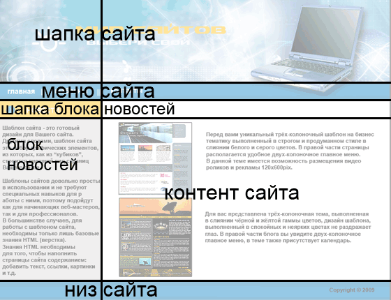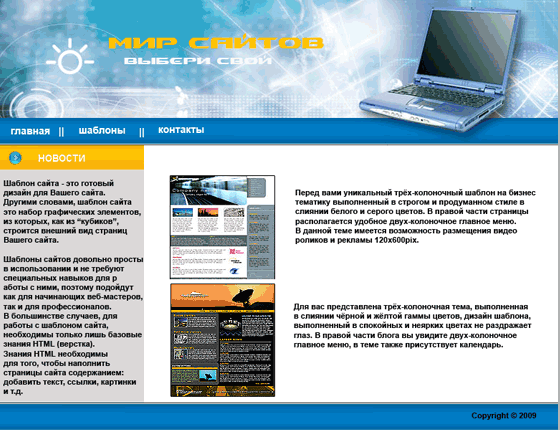 | Шаблон сайта - это готовый дизайн для Вашего сайта. Другими словами, шаблон сайта это набор графических элементов, из которых, как из “кубиков”, строится внешний вид страниц Вашего сайта. Шаблоны сайтов довольно просты в использовании и не требуют специальных навыков для работы с ними, поэтому подойдут как для начинающих веб-мастеров, так и для профессионалов. В большинстве случаев, для работы с шаблоном сайта, необходимы только лишь базовые знания HTML (верстка). Знания HTML необходимы для того, чтобы наполнить страницы сайта содержанием: добавить текст, ссылки, картинки и т.д. | Здесь - контент |