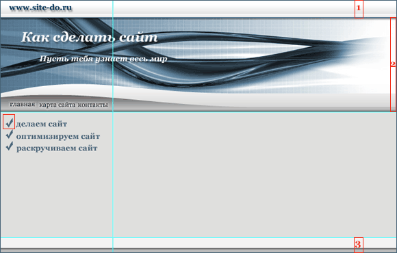 Теперь подкорректируйте расположение направляющих и собственно макет готов, осталось только его разрезать. Сделать это можно либо в этой же программе (как читайте на странице как разрезать макет сайта), либо в ImageReady.