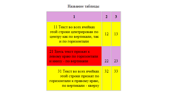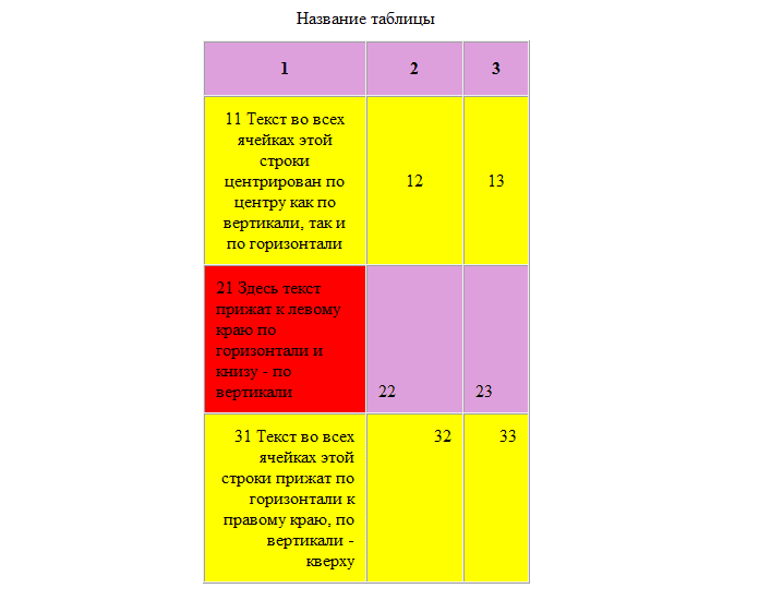 Эти же параметры можно применять и к отдельным ячейкам, т.е. к любому тегу <td>, действие будет распространяться только на саму ячейку.