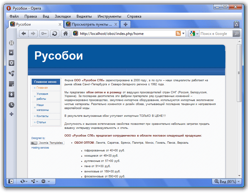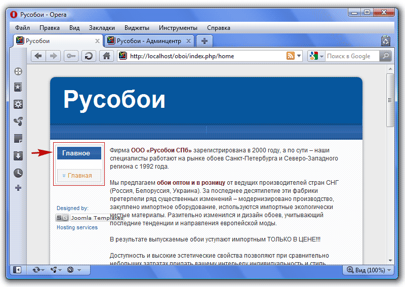 Итак, мы создали 4 статьи, и пришло время создать главное меню сайта. Если посмотреть на сайт-образец, то мы увидим два меню: Главное меню (горизонтальное наверху) и Меню каталога товаров (вертикальное слева). На сайте, который мы создаем, мы видим пока только одно Главное меню, и расположено оно слева:
