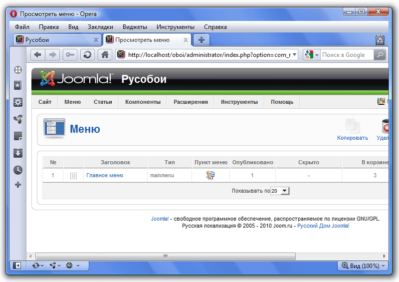 Давайте посмотрим, как вообще работают меню в Joomla. Сами меню создаются в пункте Меню - Меню: