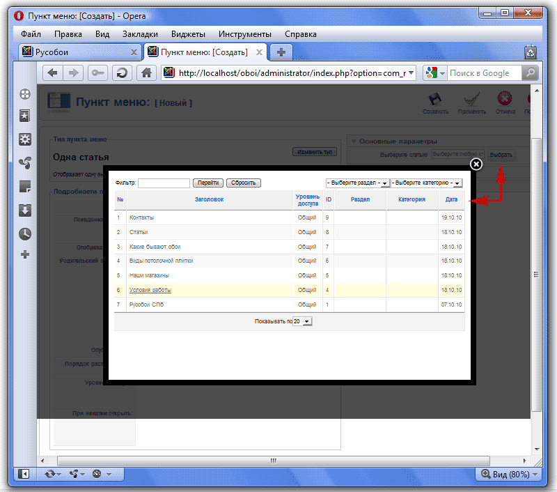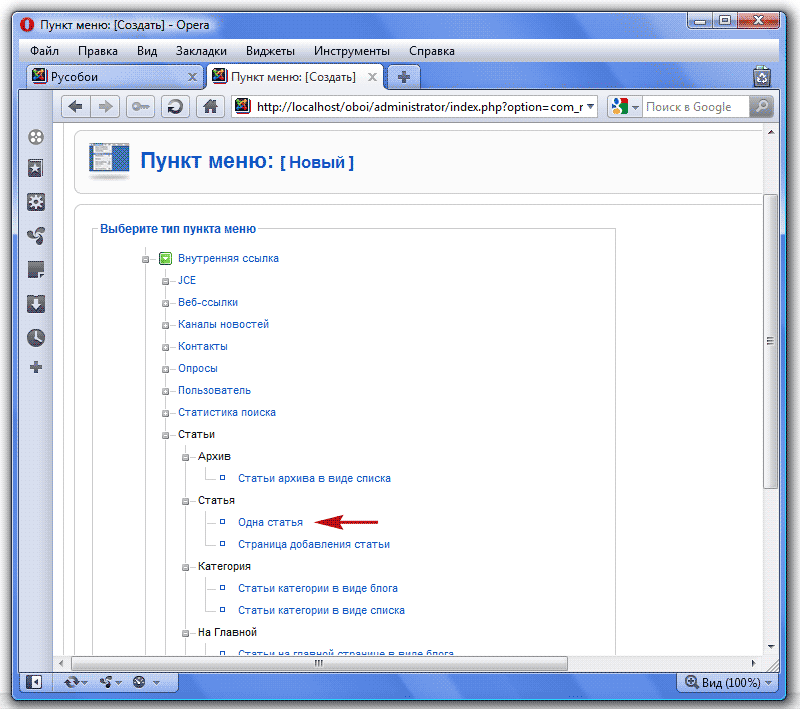 Сейчас у нас только один пункт - Главная страница сайта. Давайте добавим наши пункты: Условия работы, Наши магазины, Контакты и Статьи. Для этого щелкаем по кнопке Создать. В открывшемся окне нам надо выбрать тип пункта меню. Все пункты нашего Главного меню указывают на обычные страницы сайта, поэтому мы выбираем тип - Статья, а в нем - Одна статья: