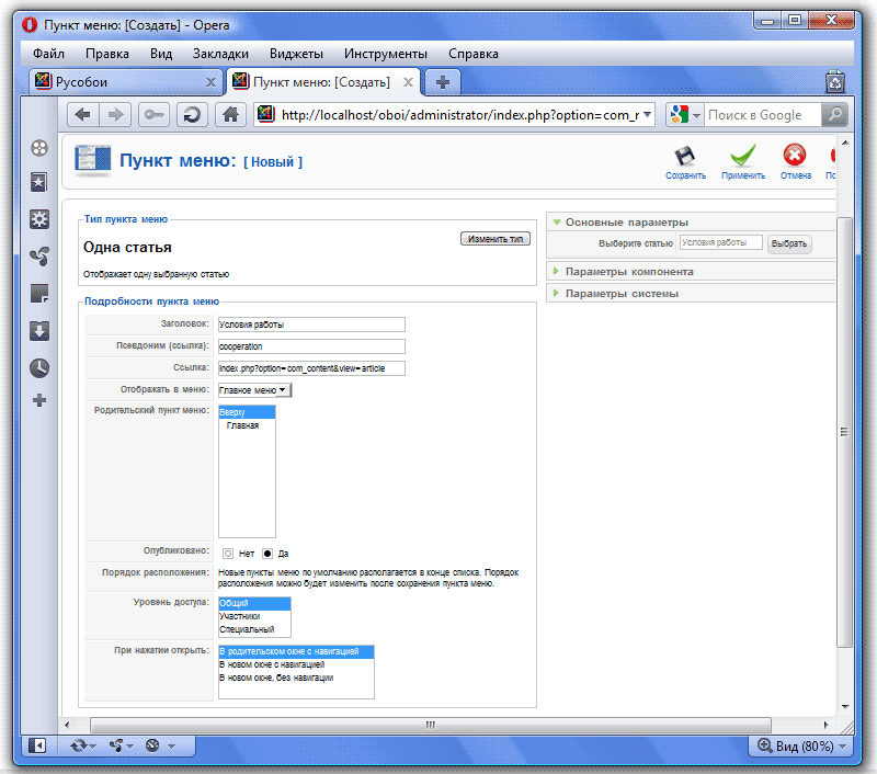 Обратите внимание в основных параметрах, в поле Выберите статью появилось название нашей статьи. Нажимаем кнопку Сохранить и видим, что наш пункт появился в Менеджере пунктов:
