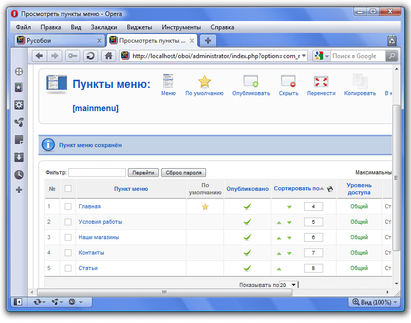 Заходим в модуль Главное меню для его редактирования (щелкаем по названию):