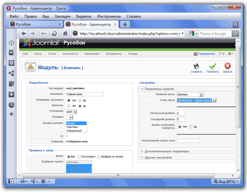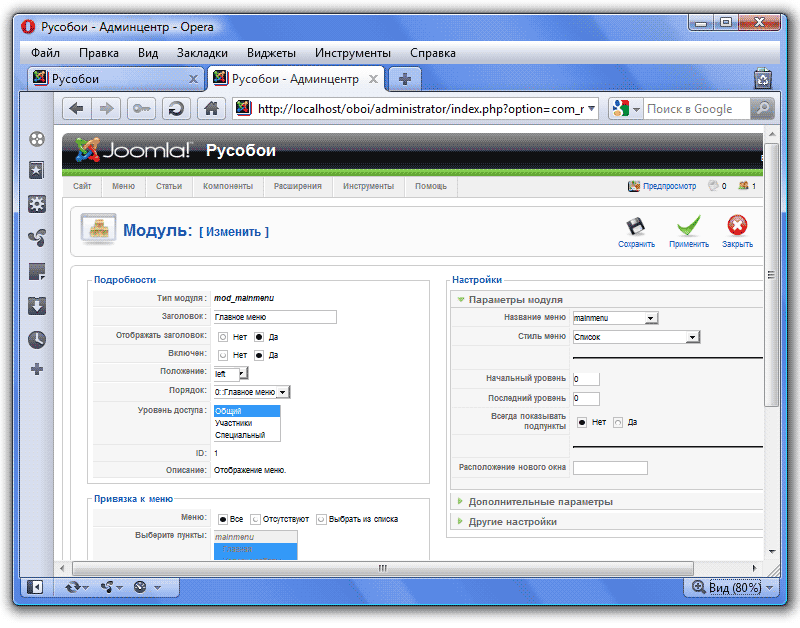 - Создать и настроить модуль для работы меню в Расширения - Модули.
