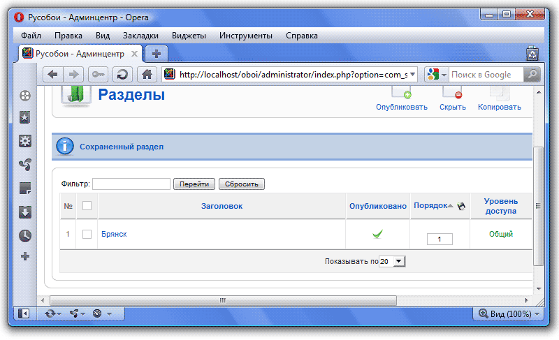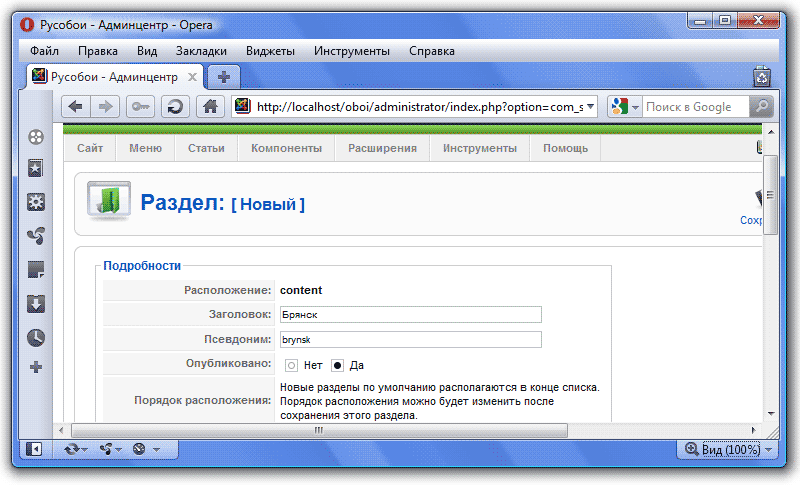 В открывшемся окне нам надо указать только заголовок и псевдоним раздела: Брянск (brynsk). Остальные настройки оставляем без изменений: