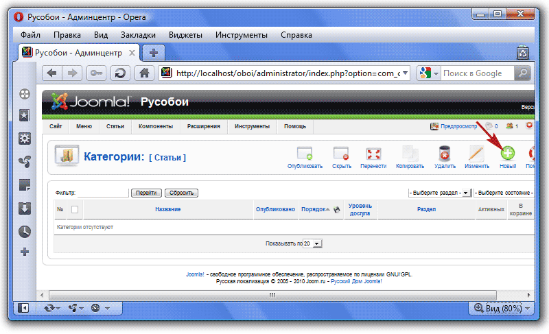 У нас еще нет ни одной категории, поэтому список пуст. Нажимаем на кнопку Новый, чтобы создать первую категорию: