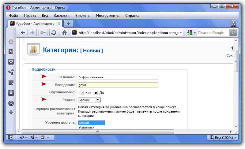 В открывшемся окне нам надо указать название, псевдоним и раздел, к которому категория принадлежит. В разделе Брянск есть 4 категории: гофрированные, дуплекс, моющиеся и пена. Создадим первую категорию: