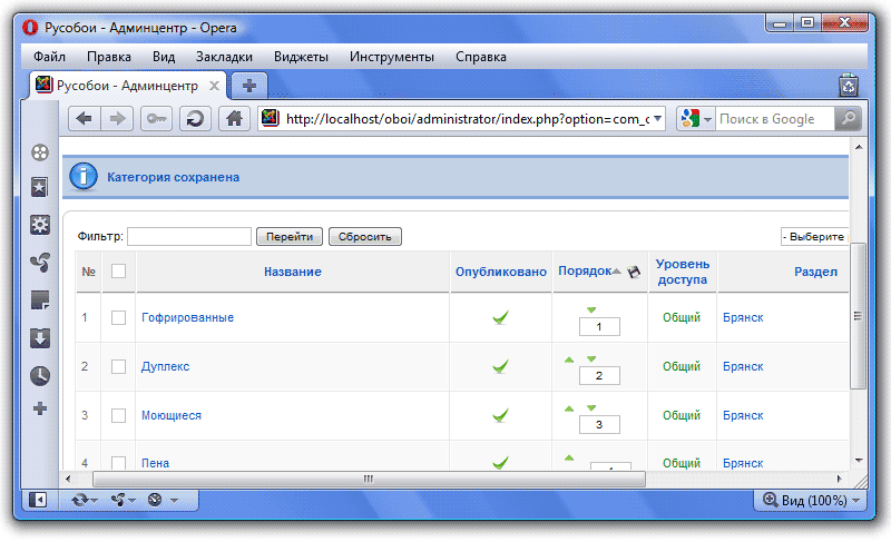 Нажимаем кнопку Сохранить. Аналогично создадим еще три категории, принадлежащих разделу Брянск: дуплекс (duplex), моющиеся (moyka) и пена (pena). Теперь в Менеджере категорий мы видим наши категории: